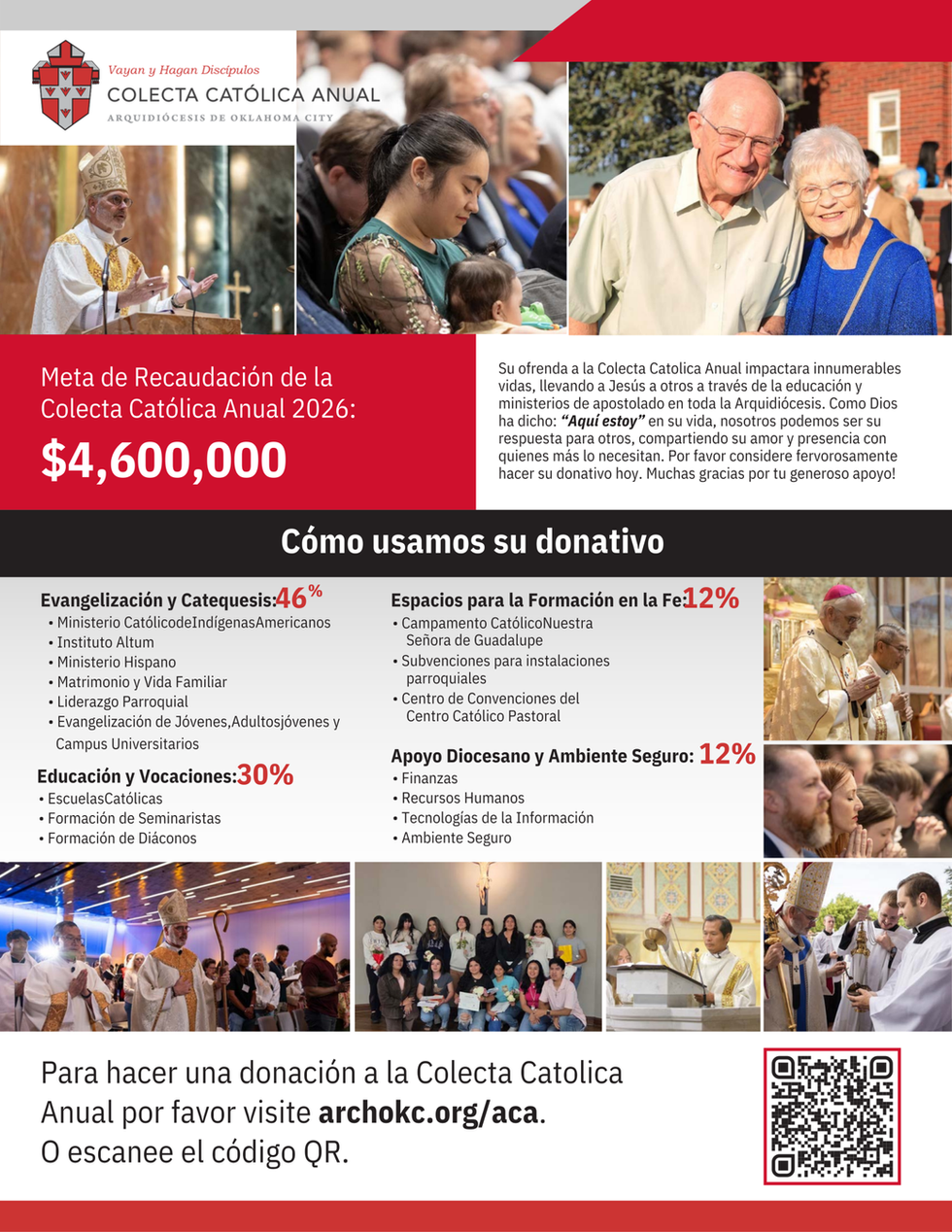 La Campaña Católica Anual está aquí! A través de la Campaña, nos unimos para apoyar vitales ministerios en toda la Arquidiócesis de Oklahoma City que comparten el amor de Dios con miles de personas cada año. Estos ministerios proveen educación católica para niños, formación de seminaristas, preparación matrimonial y fortalecimiento de parejas, y espacios para retiros, conferencias y campamentos. Nada de esto es posible sin su generosidad. Tan pronto como se acerca el fin de semana de compromiso, por favor, fervorosamente piense en su apoyo a la Campaña Católica Anual. Para conocer más o hacer su ofrenda hoy, visite: www.archokc.org/aca